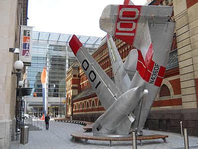 Look what I found this morning!  There's a new sculpture in Lenfest Plaza by the Pennsylvania Academy of Fine Arts -- Grumman Greenhouse by Jordan Griska.   It was created by taking a Cold War surplus Grumman Tracker II, folding it, and converting parts of its interior into greenhouses.